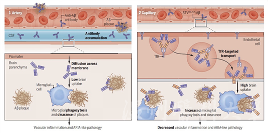 传统的抗体药物借由损伤的血脑屏障,通过脑脊液间接进入脑组织,但这种方式入脑实质效率低,且其血中抗体容易在脑血管周围富集,并与血管壁沉积的Aβ结合,诱发炎症反应和微出血。