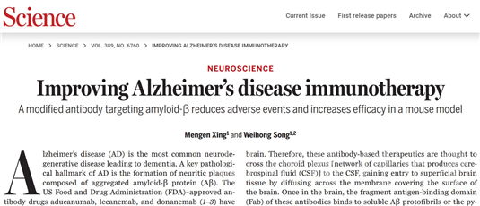 8月8日,温州医科大学学术副校长、老年研究院院长,加拿大健康科学院院士,瓯江实验室主任,国际阿尔茨海默病研究与防治中心主任宋伟宏院士团队受邀在国际顶尖学术期刊Science《科学》Perspective专栏发表题为“Improving Alzheimer’s Disease immunotherapy”(改善阿尔茨海默病免疫治疗)的文章,深入评述了一种新型单克隆抗体脑内递送方法,在阿尔茨海默病动物模型中展现出更强效、更安全的治疗潜力,探讨并展望了改善阿尔茨海默病免疫治疗的方法。