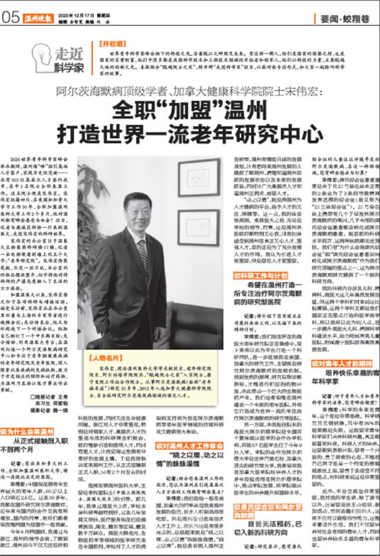 【人物名片】 宋伟宏,现任温州医科大学学术副校长、老年研究院院长、阿尔伯塔学院院长,“瓯越院士之家”入家院士,康宁医院工作站合作院士。从事阿尔茨海默病(俗称“老年痴呆症”)研究30多年,2012年入选加拿大健康科学院院士,系全球研究阿尔茨海默病领域的顶尖人才。
