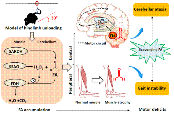 长时间太空飞行或返回地球,航天员常常遭受步伐紊乱、小脑共济失调,但分子机制不清。本研究采用小鼠后肢悬挂模型(HU)来模拟太空宇航员失重状态,发现随悬挂时间延长,小鼠小脑顶核和后肢腓肠肌中甲醛急剧蓄积。进一步,用细胞模拟失重,采用细胞旋转模型,发现人SY5Y细胞的线粒体内肌氨酸脱氢酶(SARDH)脱甲基产生甲醛;人血管内皮细胞的脲敏感单胺氧化酶(SSAO)脱氨基产生甲醛。这说明:失重诱发神经元线粒体产生甲醛,同时血管内皮也蓄积甲醛。