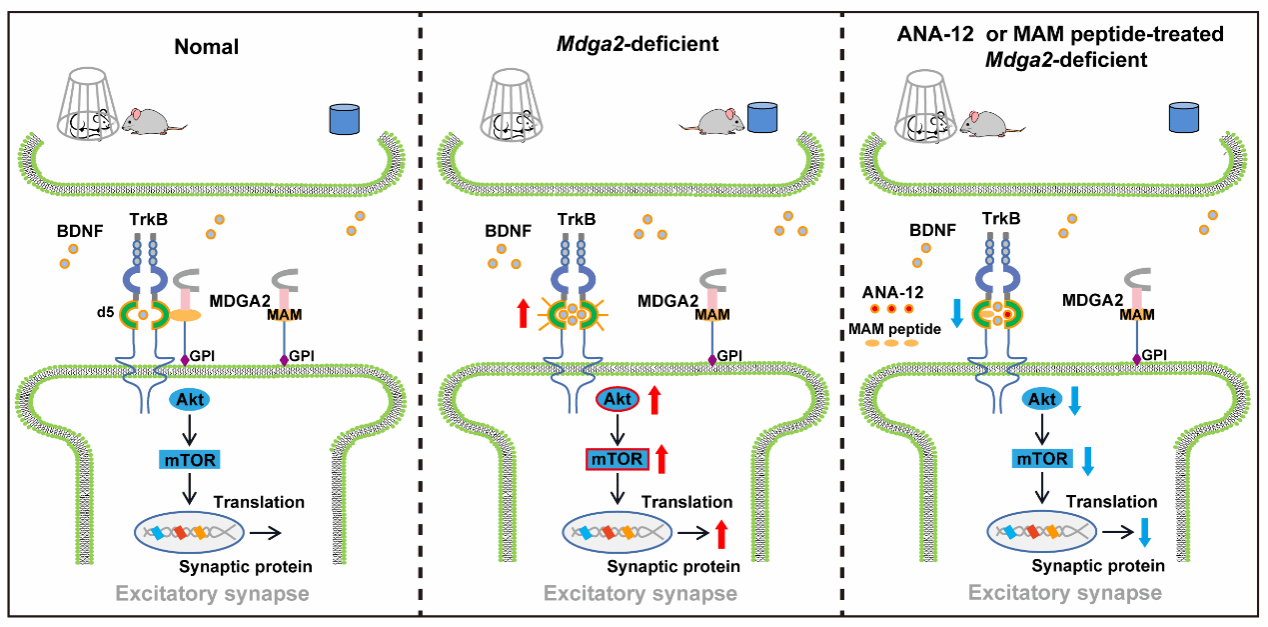 在本项研究中,团队首次发现MDGA2与受体酪氨酸激酶(Tropomyosin receptor kinase B,TrkB)相互作用,抑制脑源性神经营养因子(Brain-Derived Neurotrophic Factor,BDNF)与TrkB的结合及其下游信号通路。当MDGA2缺失时,BDNF/TrkB信号通路异常激活,导致兴奋性突触蛋白过量表达,引起ASD相关行为缺陷。通过使用MDGA2衍生多肽抑制BDNF与TrkB的结合,以及使用TrkB抑制剂ANA-12,能够显著改善MDGA2缺陷小鼠的自闭样行为障碍。