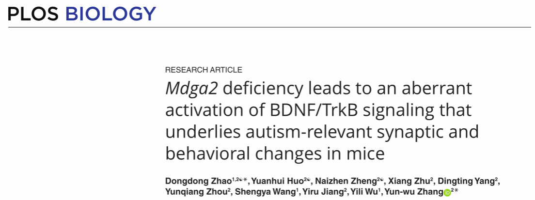 2025年4月1日,温州医科大学老年研究院院长宋伟宏院士团队赵东栋副研究员与厦门大学张云武教授合作在国际生物学领域极具影响力的1区Top期刊《Plos Biology》发表了题为“Mdga2 deficiency leads to an aberrant activation of BDNF/TrkB signaling that underlies autism-relevant synaptic and behavioral changes in mice”的研究论文,首次揭示了突触相关蛋白(MAM domain containing glycosylphosphatidylinositol anchor 2,MDGA2)在自闭症谱系障碍(Autism Spectrum Disorder,ASD)发病中的全新机制。该研究不仅深入剖析了MDGA2缺失如何引发与ASD相关的突触功能异常和行为改变,还发现通过靶向神经突触信号通路在分子层面进行调节,有望为ASD的治疗提供全新的靶点,为未来相关研究和临床治疗带来了新的曙光。