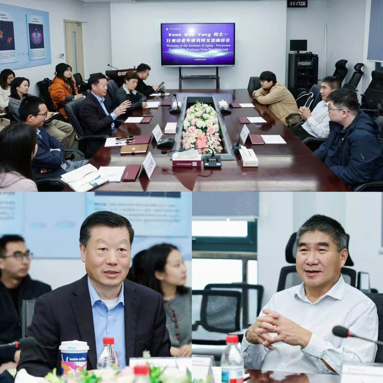 报告结束后,Voon Wee Yong院士一行访问了老年研究院,与宋伟宏院士及我院师生代表交流座谈。宋伟宏院士围绕老年研究院及老年医学学院的建设发展,系统介绍了我院研究方向、人才队伍、科研成果与研究生培养等基本情况,并展示了我院特色项目——中国健康老龄化防治阿尔茨海默病研究计划(HAPCAD)。此外,宋院士对Voon Wee Yong院士在报告中分享的研究内容表达了浓厚兴趣,并希望双方未来能在课题研究、学生联合培养与交流等方面展开深入合作。Voon Wee Yong院士高度评价了我院在老年医学领域的快速发展和持续深耕,并对未来深化合作与交流表达了积极期待。