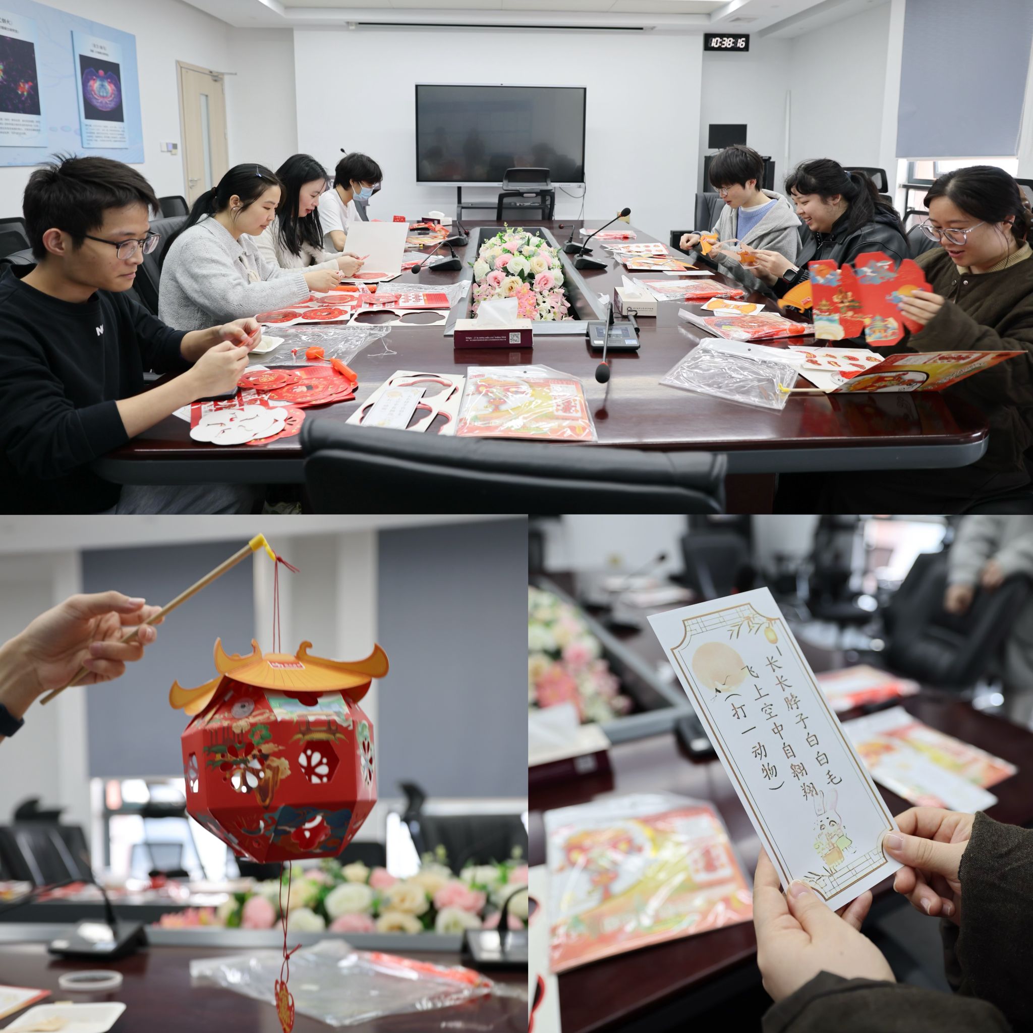 会议室里,师生们围在灯谜区,有人抬头看谜面,有人低头思考,还有几个人凑在一起讨论。猜完灯谜后,大家围坐在一起做花灯。做灯笼看似简单,实则需要耐心——拼接骨架要稳固,粘贴灯面要平整,安装流苏要对称。师生们边做边聊,互相帮忙,现场气氛轻松融洽。