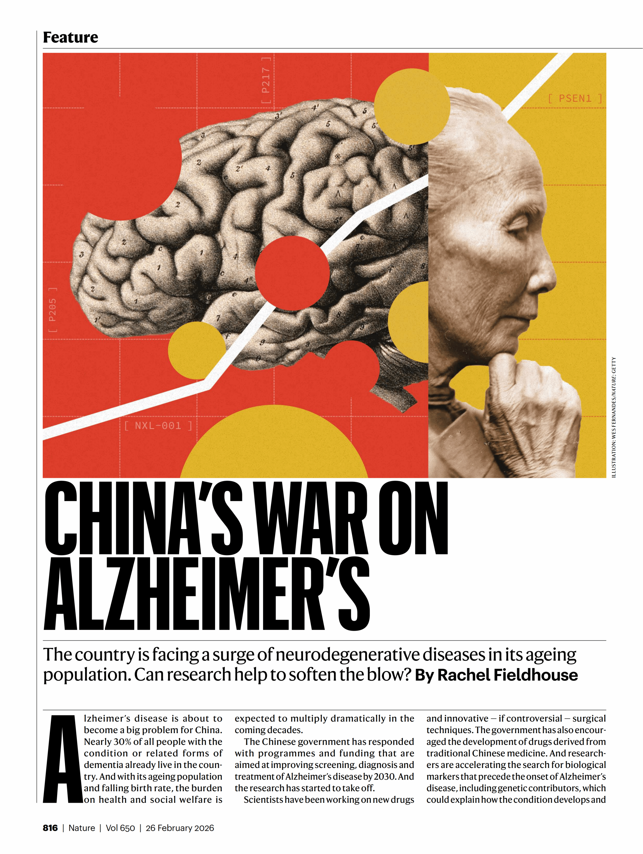 2026年2月24日,国际顶级学术期刊Nature刊发头条文章“中国对抗阿尔茨海默病的战争”,聚焦中国在阿尔茨海默病(AD)防治领域的战略布局与科研突破。文章指出,面对人口老龄化带来的日益严峻的疾病负担,中国通过系统性推进资金投入、人才集聚、临床研究体系建设及自主药物研发,已形成具有全球借鉴意义的实践路径。报道援引英国科学家John Hardy的评价称:“也许中国会成为下一个领跑者。”
