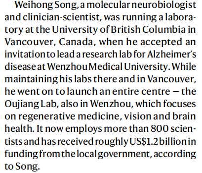 在这篇重磅报道中,国际知名的阿尔茨海默病专家、加拿大健康科学院院士、温州医科大学学术副校长、老年研究院院长、瓯江实验室主任宋伟宏,作为中国AD研究领域的领军科学家之一,接受了Nature专访。他介绍了目前开展的研究工作,阐述了中国对阿尔茨海默病防治研究的高度重视与持续投入,并分享了国家对青年科学家的扶持举措。