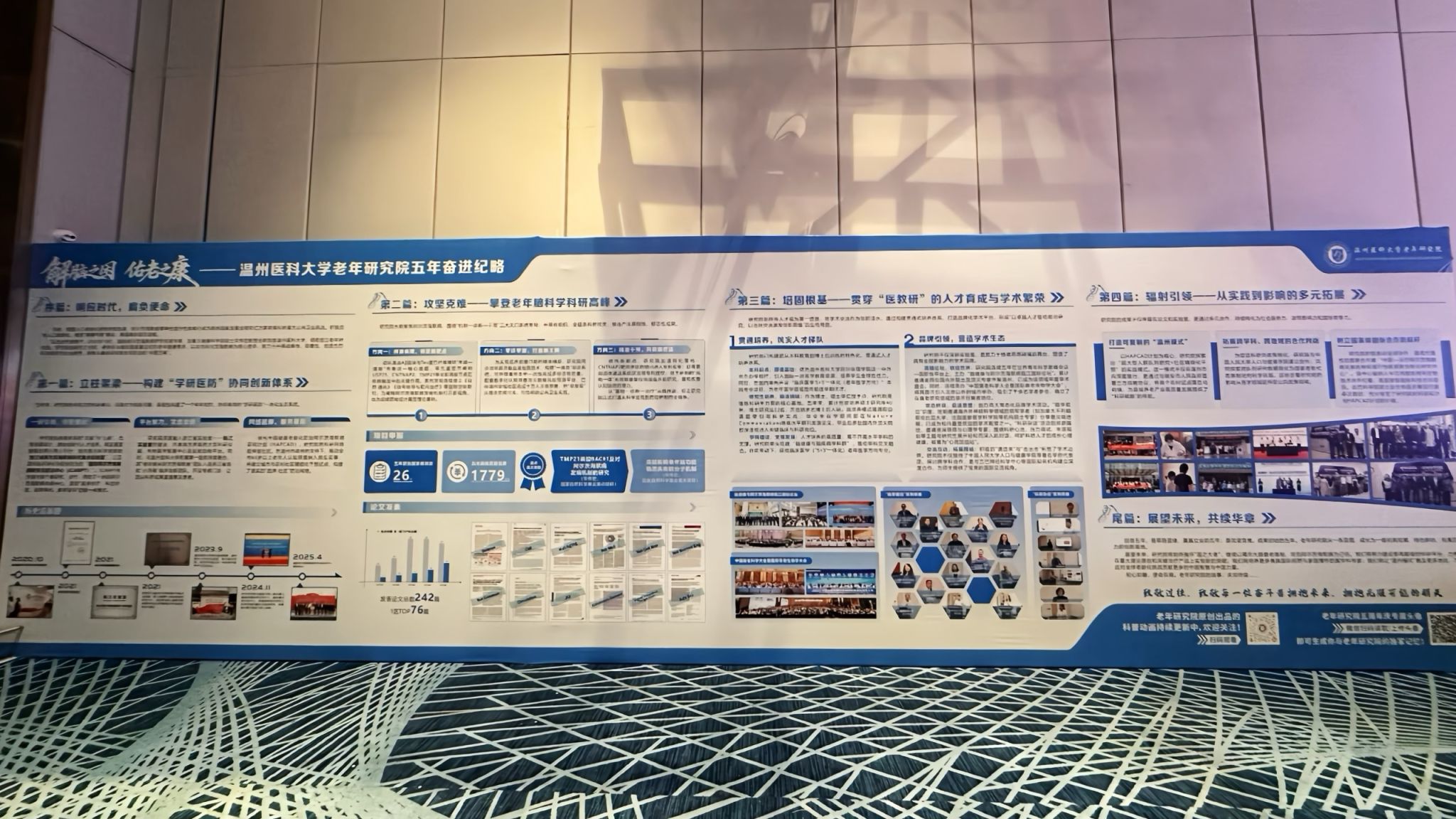 2025年恰逢老年研究院成立五周年。本次大会同期特别举办了“解脑之困,佑老之康——温州医科大学老年研究院五年奋进纪略”主题历程展,生动回顾了研究院五年来砥砺前行的发展足迹与扎实丰硕的工作成果,也勾勒出我院扎根温州、投身老年研究事业硕果绽放的壮阔画卷。