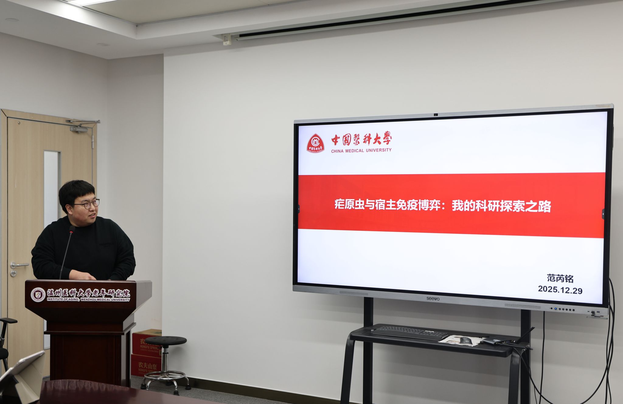 2025年12月29日,中国医科大学范芮铭博士应邀做客温州医科大学老年研究院,以“疟原虫与宿主免疫的博弈:我的科研探索之路”为题,为我院师生作“科研杂谈”专题讲座。本次讲座由我院邢蒙恩副研究员主持。